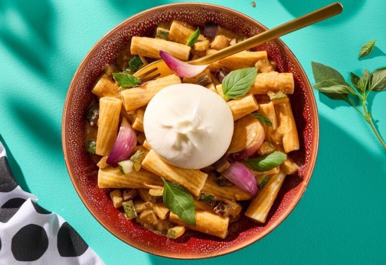 Rigatoni mit Aubergine, Burrata und Thai-Basilikum
