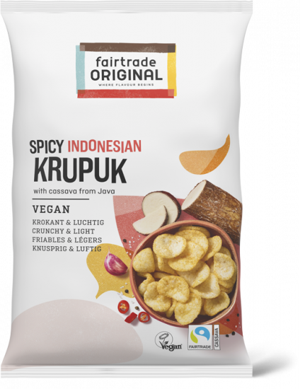 Zu Ehren seiner indonesischen Wurzeln haben wir unsere vegane Version auch stolz „Krupuk“ genannt. Sonnengetrocknetes Maniokmehl wird von unserem Partner in Surabaya zu kleinen Scheiben Teig geformt. In den Niederlanden werden die Chips dann in Sonnenblumenöl gebraten und mit Gewürzen verfeinert.