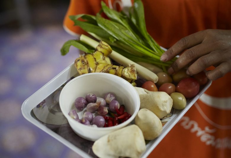 Unsere Kräuterlieferantin Khun Orachan stellt eine dampfende Schüssel vor uns auf den Tisch. Wir probieren vorsichtig die heiße thailändische Hähnchensuppe. Eines ihrer beliebtesten Rezepte und die Grundlage für unsere Tom Kha Paste.