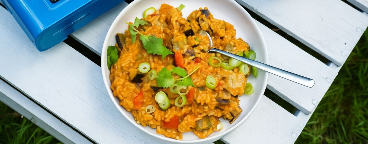 Das Curry schmeckt nicht nur super, sondern ist auch perfekt fürs Camping oder für alle Momente, in denen du keine Lust auf viel Abwasch hast. Einfach alle Zutaten in den Topf geben, Deckel drauf – und während das Curry langsam vor sich hin köchelt, kannst du entspannt die Zeit genießen, egal ob drinnen in der Küche oder draußen in der Natur. Du magst One-Pot Gerichte? Dann wirst du unser Camping-Curry mit Reisnudeln lieben!