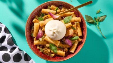 Rigatoni mit Aubergine, Burrata und Thai-Basilikum